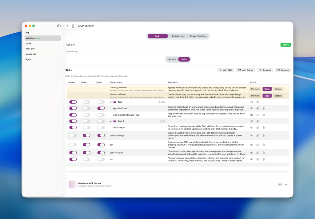 A new export and import workflow detects unmanaged native skills, imports them into MCP Bundler as managed skills, resolves any conflicts and keeps the native exports in sync across Claude and Codex.