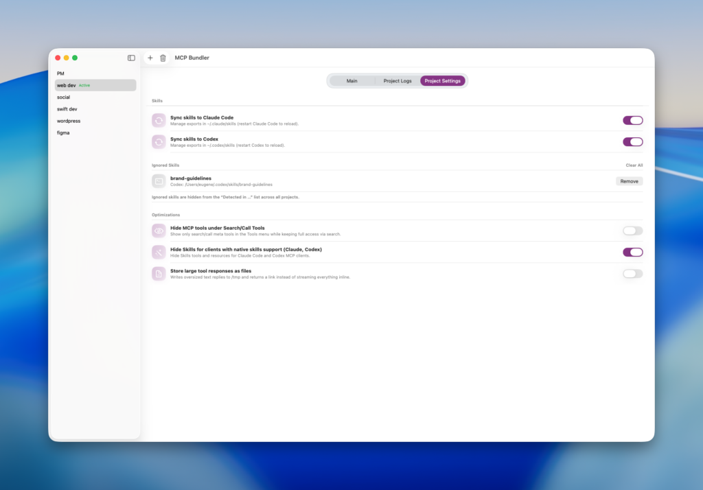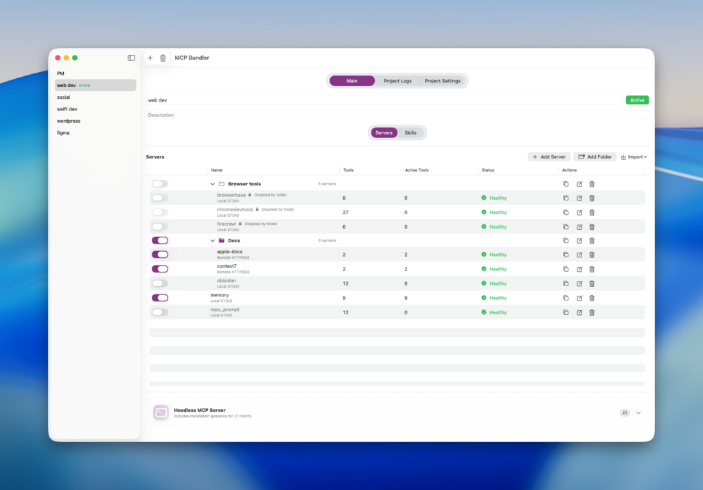 Build 19 adds several improvements to how MCP Bundler manages and presents skills. The focus of this release is on synchronizing native skills, organising them in global folders and refining the user interface.